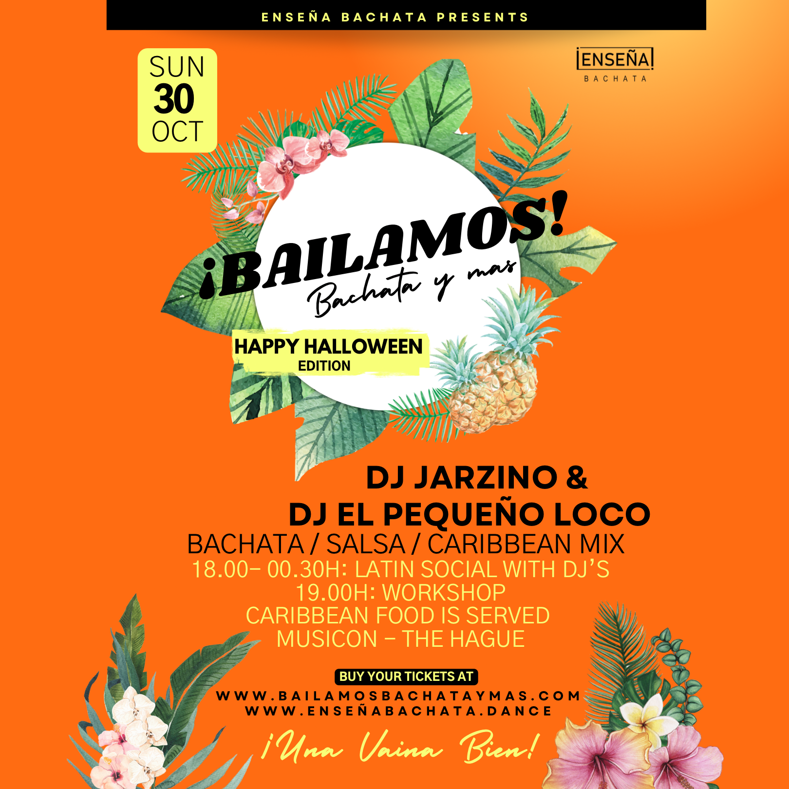 Pompoenen en maanlicht tijdens de Happy Halloween editie van Bailamos bachata y mas. Onze DJ’s toveren een lach op je gezicht met héél veel bachata en een flinke scheut merengue, salsa en ritmo kombina. Volgens ons de perfecte mix om je hart te laten dansen. We hebben er zin in! Dans je met ons mee?